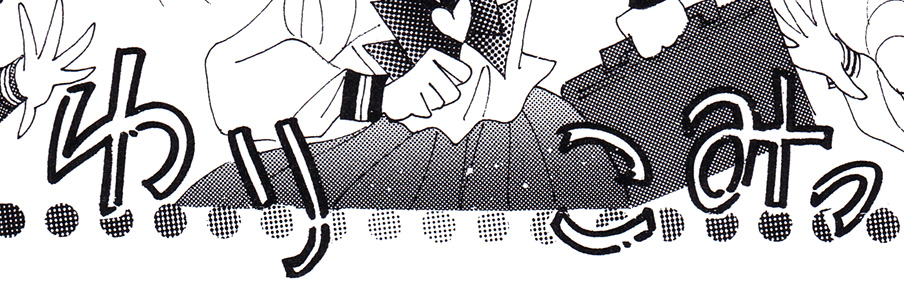 ! Важно: дублируй слой оригинального японского скана, чтобы всегда иметь его в неизмененном виде и иметь возможность сравнить с твоей ретушью, а также без проблем изменить какую-то часть твоей ретуши. Если все будет происходить на одном слое, пути назад уже не будет :( Лучше всего создавай отдельный слой для ретуши каждого кадра в группе "ретушь". - Теперь, когда японский текст аккуратно удален, время вписать русский текст! Когда использовать какой шрифт см. в разделе "Обзор шрифтов" этого учебника.